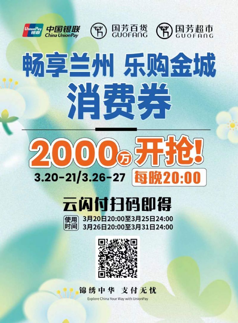 本次消費(fèi)券具體發(fā)放時(shí)間為3月20日至3月31日,將分2個(gè)階段4個(gè)批次發(fā)放,分別為3月20日、3月21日、3月26日、3月27日的每晚20:00至24:00。消費(fèi)券涵蓋國(guó)芳百貨、國(guó)芳超市以及國(guó)芳百貨內(nèi)的餐飲場(chǎng)所等3個(gè)場(chǎng)景共計(jì)38萬(wàn)余張,消費(fèi)范圍覆蓋美妝、服飾、餐飲及國(guó)芳超市等多品類(lèi)消費(fèi)場(chǎng)景,旨在激發(fā)春季消費(fèi)潛力,鞏固傳統(tǒng)消費(fèi),共同繁榮城關(guān)商貿(mào)經(jīng)濟(jì),助推零售商業(yè)市場(chǎng)平穩(wěn)發(fā)展。(廣大市民將通過(guò)“云閃付”APP領(lǐng)取并核銷(xiāo),具體活動(dòng)規(guī)則、適用范圍等信息可登錄“云閃付”APP查看。)